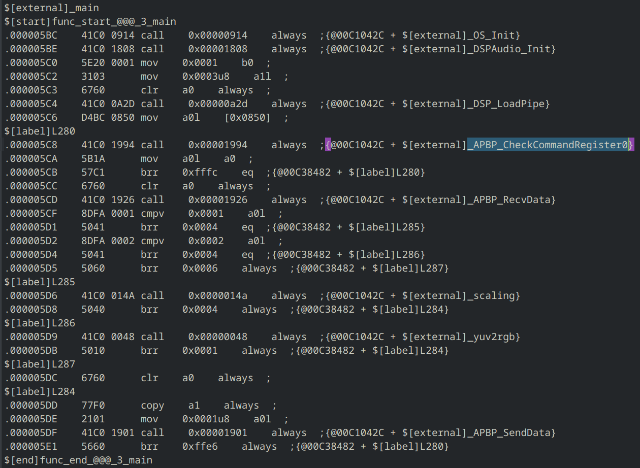 CAM TRANSFER: CNT=EE06 CROP=00180038/00A700C6 ARM9 NDMA1 START MODE 0B, 04004204->0221E0E0 LEN=10368 BLK=504 CNT=CB044000 So what does this all mean? The camera is set to 256x192, nothing special there. However, the settings used on the camera interface enable cropping, which is interesting. Basically, it only retains a 144x144 section of the camera frame. Which is confirmed by the DMA parameters. The total length is 10368 words, which is the length of a 144x144 frame. The block length is 504 words, which corresponds to 7 scanlines of said frame. This matches the DMA interval setting on the camera interface, too. So what's the issue there? If you happen to remember, I've discussed the camera interface before. Long story short, it has a FIFO buffer that holds 512 words worth of picture data, and it triggers a DMA transfer every N scanlines, with N=1..16. When modelling this system in melonDS, I had assumed that this N would be a multiple of the frame height. But the issue became apparent after I looked at my logs: 144 is not a multiple of 7. Which meant that it was discarding the last 4 scanlines of each camera frame. Hence the rolling. So I decided to force a final DMA transfer at the end of each camera frame if there's anything left in the FIFO, which seems to be what the hardware does. Either way, this fixed the rolling issue entirely. But it didn't fix the second issue, which turned out to be unrelated. Another apparent issue is that the camera input looks very squished in melonDS. It might be good to add a "preserve aspect ratio" scaling mode to avoid that. So I had to dig deeper, once again. When trying to take a picture, the game would send a command to the DSP to tell it to scale the picture to a different size, then send it a bunch of parameters via PDATA, then... get stuck. This one proved to be tricky to figure out. I had no real idea what was going wrong... did a lot of logging and tracing, but couldn't really figure it out. Eventually, CasualPokePlayer enlightened me about what was being sent to the DSP. The mechanism used to transfer command parameters is what they call the pipe. It's a simple FIFO buffer: the ARM9 writes data into the buffer, then updates the buffer write position, and does all that by using PDATA. In this situation, the parameters that were being sent for the scaling command looked correct, but the pipe write position was zero, which, according to CasualPokePlayer, was suspicious. He was on to something. Looking at the code that was determining that value, I found that it was broken because for some reason the pipe length was zero. So I traced writes to that variable. I found that it was part of a bunch of variables that were initialized from DSP memory, through a PDATA read. Looking closer, there was another bug with PDATA reads, that caused them to be one off. When I fixed that, the freeze was fixed entirely. Finally, we get to play golf with a goofy face in melonDS. What's not to love! The game also runs quite well past the profile selfie part. Yep, it uses the DSP just to scale a picture. Also, looking at the game's DSP binary, I had an idea. This binary only supports two commands: scaling and yuv2rgb. There's also a separate command channel, and it has one command, for playing sound effects (presumably, the camera shutter sound). It would be totally feasible to HLE this shit. According to CasualPokePlayer, most of the games/apps that use the DSP seem to use one or another variant of this binary, with extra features, but same basic idea. The only exception is the DSi sound app, which uses the DSP for AAC decoding. Obviously, it would still be worth it to pursue a DSP JIT, atleast for the sake of homebrew. But the HLE route seems to also be viable, and it's piquing my interest now. Maybe not for 1.0, but I want to give it a try. |